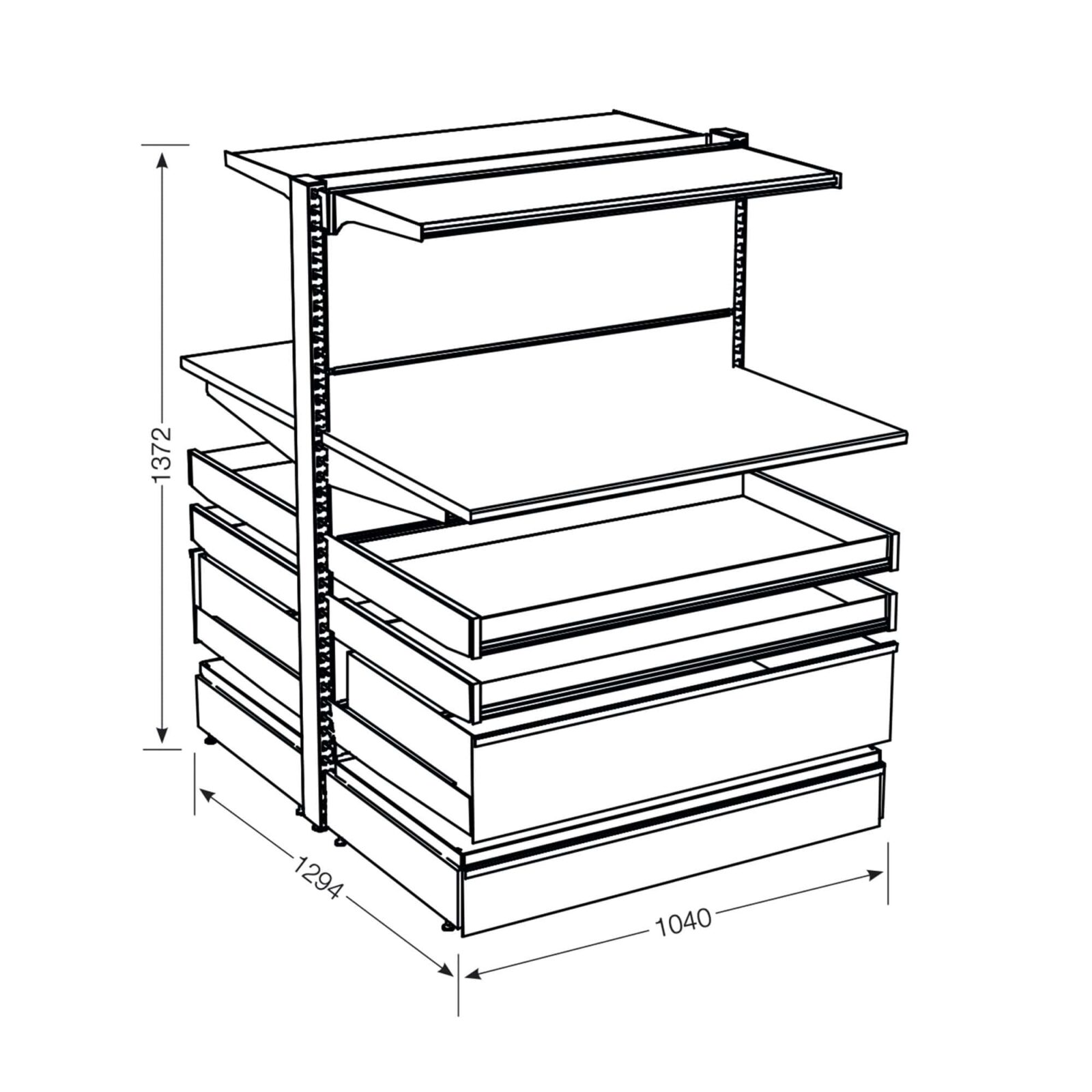 The pharmacy shelf system example shown has a combination of heavy duty deep drawers and standard drawers, both with 500mm depth below a work top with overhead storage shelf.